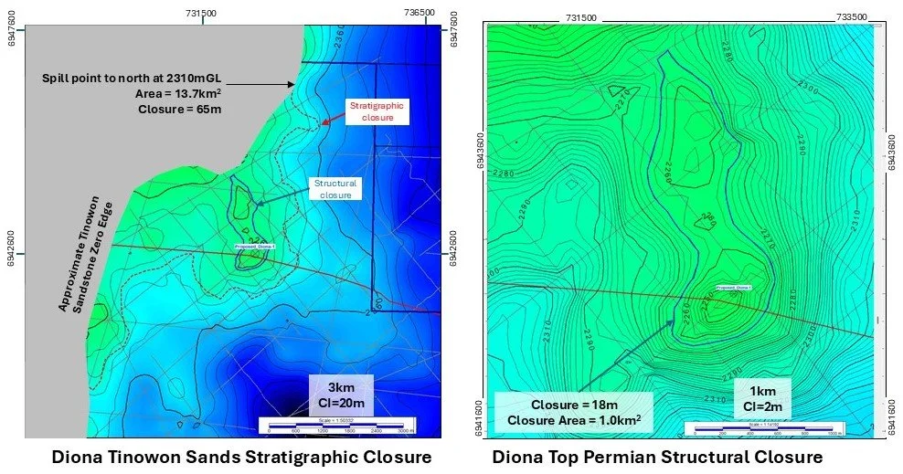 Diona Prospect is a four-way dip closed anticline at all three reservoir objectives, with upside stratigraphic trapping potential at Upper TInowon and Wallabella Sandstone levels.