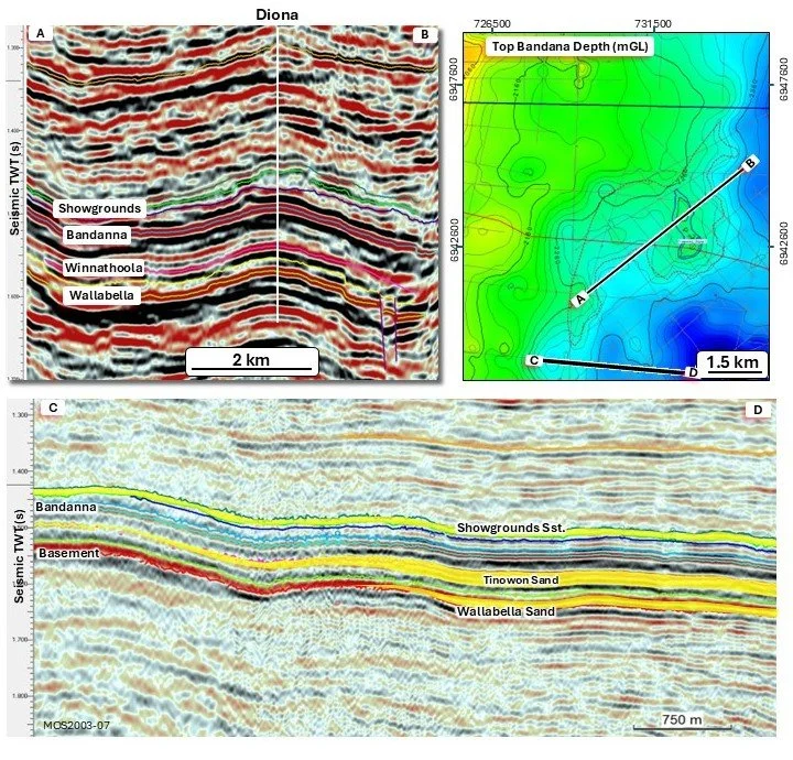 Diona is a four-way dip closed anticline which is interpreted to be present at all three reservoir objectives. At the primary Top Bandana mapping horizon, the structure has an area of 1.0km2 and a vertical relief of 18m. The Tinowon and Wallabella Sandstone targets have additional stratigraphically trapped upside associated with the inferred pinch-out of these two reservoirs against the eastern flank of the Wunger Ridge.