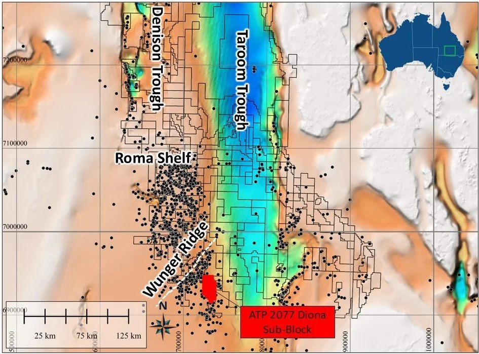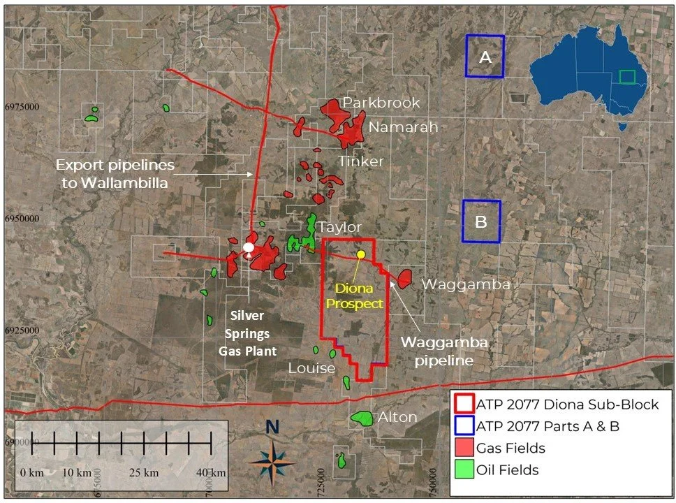 The Diona Project comprises 23 graticular blocks covering an area of 369 square kilometers within ATP 2077 and is located approximately 15km east of the Silver Springs gas processing plant. Within the Project, the Diona Prospect is located immediately beneath the Waggamba gas export pipeline, approximately 12km west of Waggamba Gas Field and 11km east of the Taylor Gas and Oil Field.